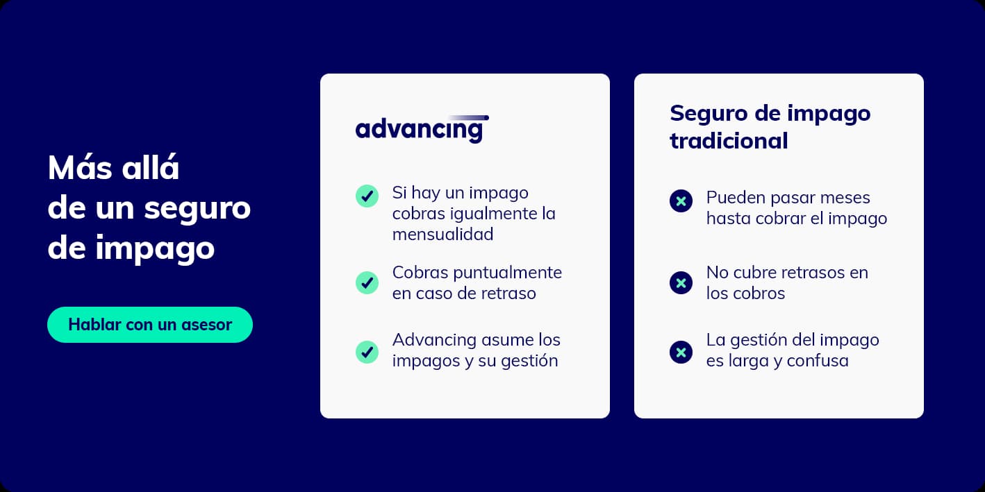 Advancing es una compañía especializada en ofrecer protección y tranquilidad a los arrendadores. ¿Cómo funciona? Se trata de un seguro de impago de alquiler que garantiza el cobro de la mensualidad el día 10 de cada mes, independientemente de si se produce algún impago o retraso en el pago.